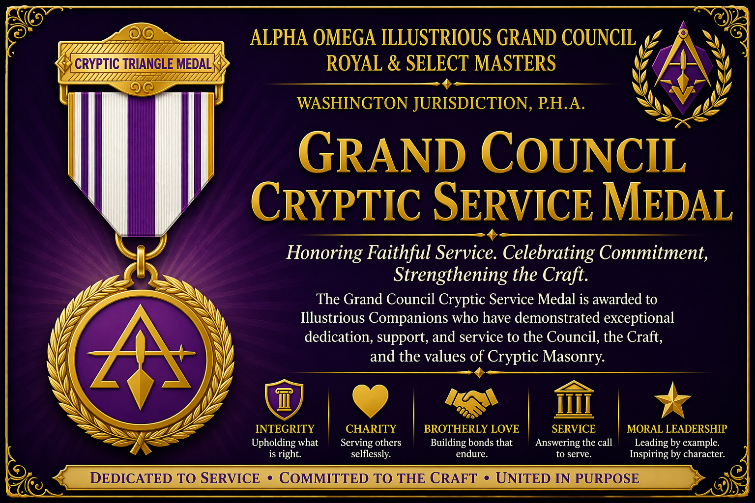 The Grand Council Cryptic Service Medal is presented in recognition of an Illustrious Companion whose faithful service, dedication, and commitment to the principles of Royal and Select Masonry have distinguished him among his peers. This prestigious award honors those whose consistent efforts and contributions have strengthened the Alpha Omega Illustrious Grand Council and advanced the work of Cryptic Masonry within the Jurisdiction.